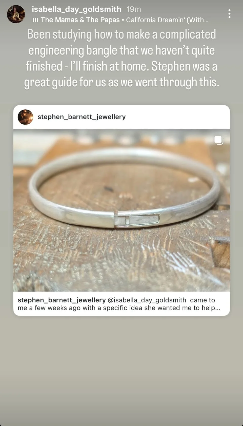 A social media post with a photo of a man and a woman smiling outdoors, with the man making a selfie. The post is praising Jessica Rosi London for a workshop day, mentioning Stephen Barnett Jewellery, with text overlays expressing gratitude and a photo of the two people standing in front of a wooden house with a glass door.